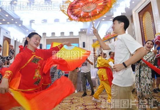 2023年7月29日,乌兹别克斯坦国家大剧院Tumor歌舞团演员与新疆社火非遗传承人互动。