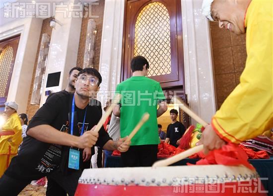 2023年7月29日,乌兹别克斯坦国家大剧院Tumor歌舞团演员与新疆社火非遗传承人互动。