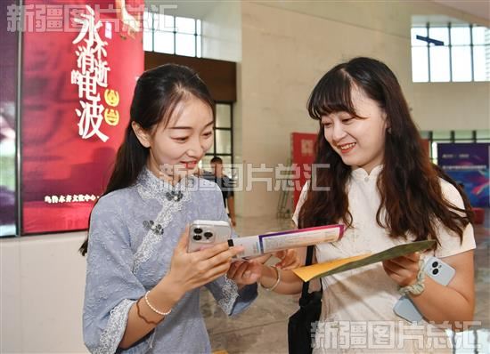 当晚,上海歌舞团舞剧《永不消逝的电波》在乌鲁木齐文化中心大剧院上演,吸引大批观众前来观赏。入场前,观众纷纷在入场票证和购买的相关文创产品上盖上专属印章,在演出海报前打卡拍照。