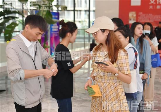 当晚,上海歌舞团舞剧《永不消逝的电波》在乌鲁木齐文化中心大剧院上演,吸引大批观众前来观赏。入场前,观众纷纷在入场票证和购买的相关文创产品上盖上专属印章,在演出海报前打卡拍照。