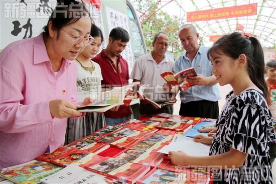 2023年7月29日,温宿县图书馆工作人员引导恰格拉克乡叶克艾日克村村民阅读书籍,培养阅读兴趣。