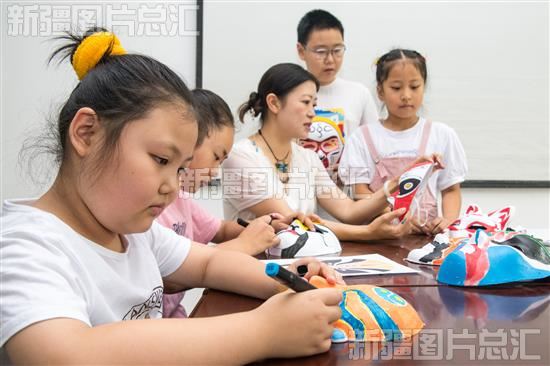 2023年7月30日,老师教孩子们画脸谱。