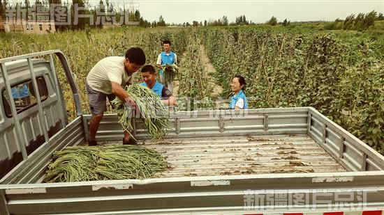 2023年8月1日,在察布查尔锡伯自治县扎库齐牛录乡开发地农村社区菜农豇豆地里,该社区助农服务小组队员在帮助菜农装运豇豆。