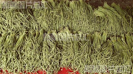 2023年8月1日,察布查尔锡伯自治县扎库齐牛录乡开发地农村社区菜农豇豆地里,已扎好的部分豇豆。
