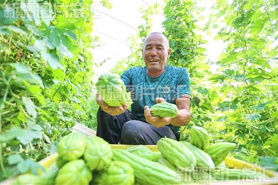 2023年8月1日,库车市乌尊镇乌尊二村村民在采收苦瓜。