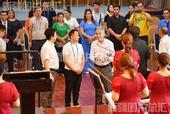 2023年7月31日,塔吉克斯坦罗拉国家功勋歌舞团演职人员和新疆艺术剧院管弦乐团的演员交流。