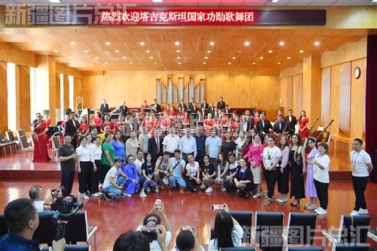 2023年7月31日,塔吉克斯坦罗拉国家功勋歌舞团一行聆听新疆艺术剧院管弦乐团演奏后合影。