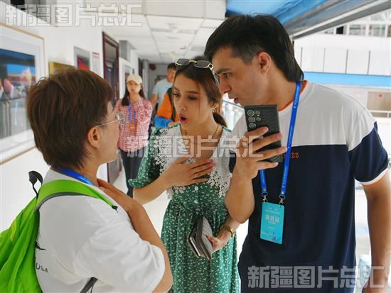 2023年7月31日,塔吉克斯坦罗拉国家功勋歌舞团演员在新疆艺术剧院参观时,向翻译学习汉语言。