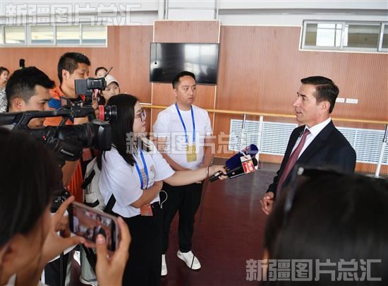 2023年7月31日,塔吉克斯坦罗拉国家功勋歌舞团演职人员在新疆艺术剧院参观交流后接受媒体采访。