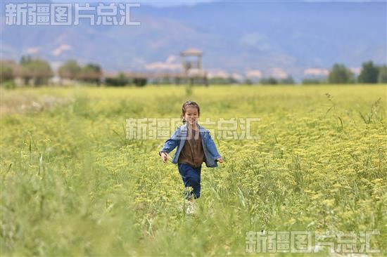 2023年8月3日,小朋友在木垒哈萨克自治县万亩茴香花海游玩。