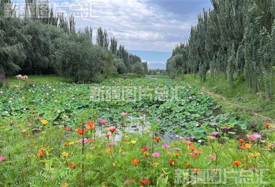 2023年8月3日,阿克苏国家湿地公园,花开烂漫、水鸟嬉戏、碧波荡漾,景色优美。