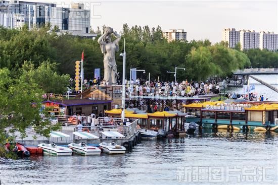 2023年8月5日,市民在克拉玛依河中心景区游览。