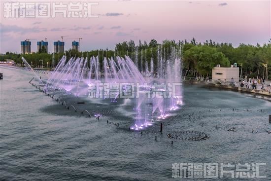 克拉玛依河中心景区的喷泉(2023年8月5日摄)。