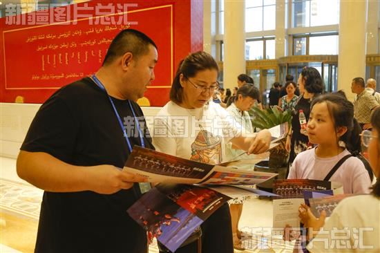 2023年8月4日,工作人员在新疆人民会堂为前来观看中央芭蕾舞团芭蕾舞剧《红色娘子军》的观众发放节目宣传册。