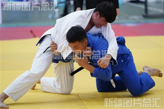 2023年8月5日,为期4天的自治区第十四届运动会柔道项目比赛在尉犁县体育馆圆满结束。图为男子柔道比赛现场。