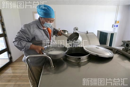 2023年8月6日,木垒哈萨克自治县雀仁乡五棵树村村民在灌装驼奶。