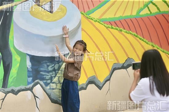 2023年8月7日,游客在农耕文化墙拍照。
