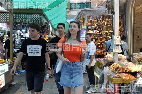 2023年8月5日,格鲁吉亚国家舞蹈团的演员在新疆国际大巴扎参观。