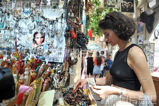 2023年8月5日,格鲁吉亚国家舞蹈团的演员在新疆国际大巴扎选购工艺品。