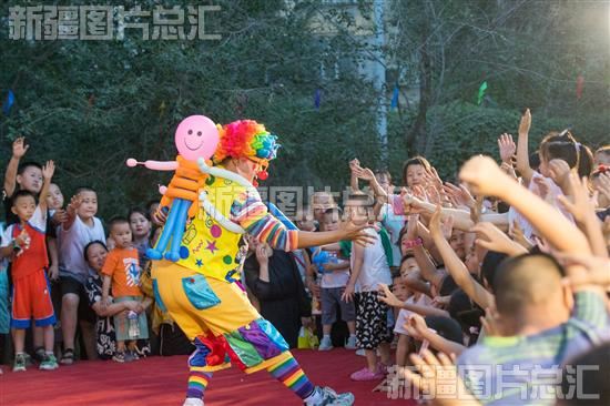 2023年7月28日,社区小丑演员正在和孩子互动。