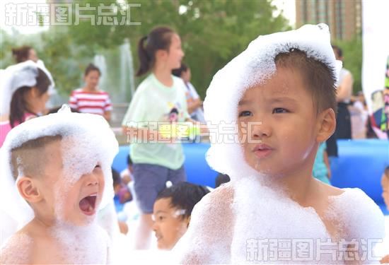 2023年8月6日,小朋友体验“泡沫大战”游戏。
