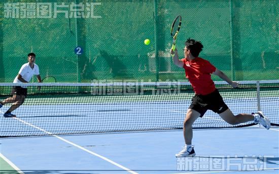2023年8月9日,自治区第十四届运动会网球比赛中,运动员反手击球。