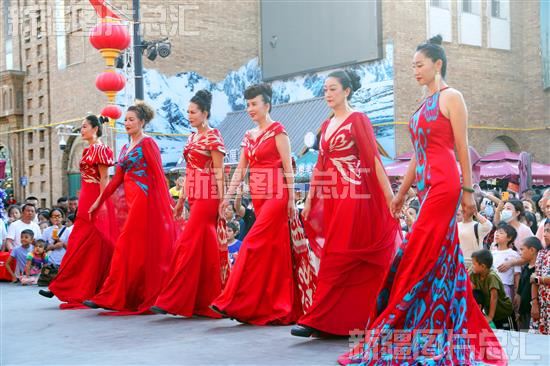 2023年8月12日,新疆国际大巴扎景区上演时装秀,吸引众多游客和市民前来欣赏。