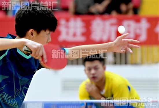 2023年8月10日,乒乓球男子甲组双打项目比赛现场,球员在发球。石榴云/新疆日报记者 韩亮摄