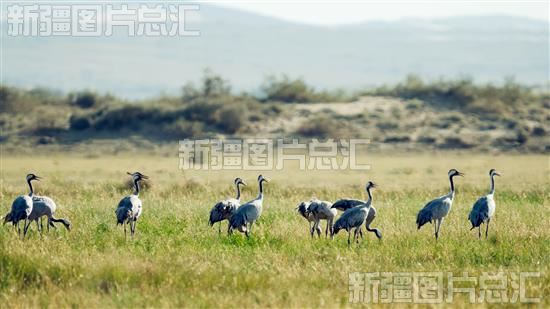 2023年8月21日,成群的蓑羽鹤在哈巴河县科克托海湿地觅食嬉戏。