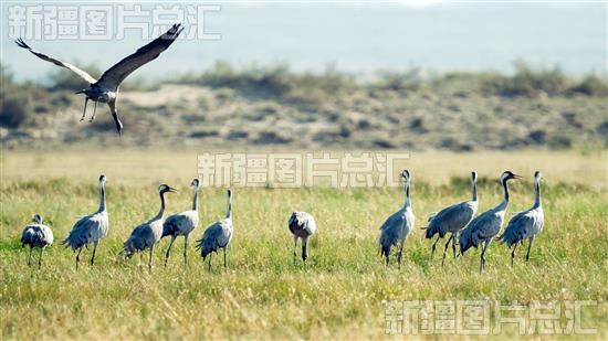 2023年8月21日,成群的蓑羽鹤在哈巴河县科克托海湿地觅食嬉戏。