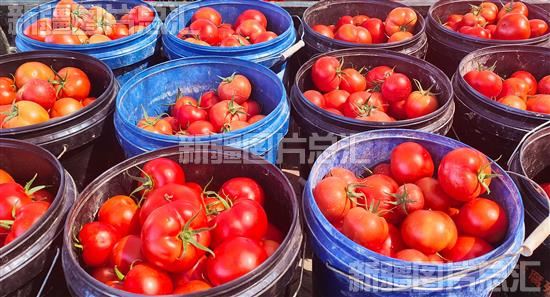 2023年8月20日,在新疆伊犁哈萨克自治州察布查尔锡伯自治县良繁场蔬菜种植基地,采摘的一桶桶西红柿红润饱满。