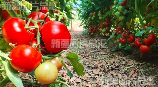 2023年8月20日,察布查尔锡伯自治县良繁场蔬菜种植基地,一串串成熟的西红柿绿叶间挂满枝头,娇艳欲滴。