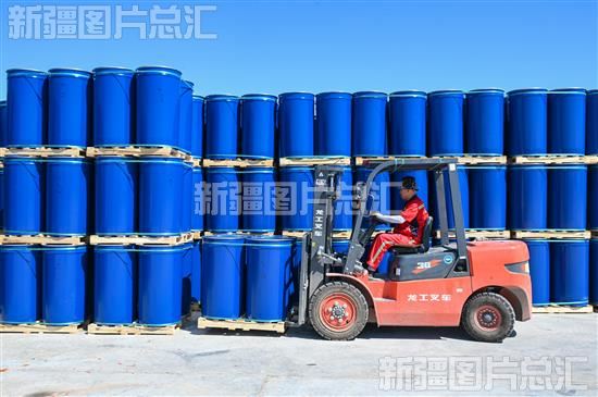 2023年8月22日,新疆新润泽食品有限公司员工转运桶装番茄。