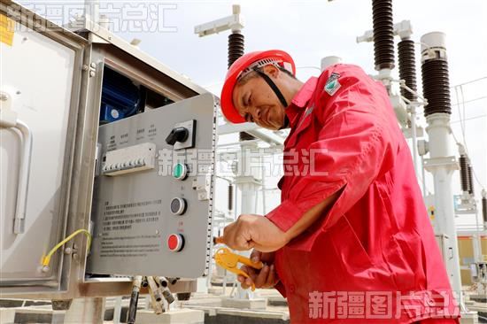 2023年8月22日,塔里木油田工人在富源联合站建设现场检查电动设施。