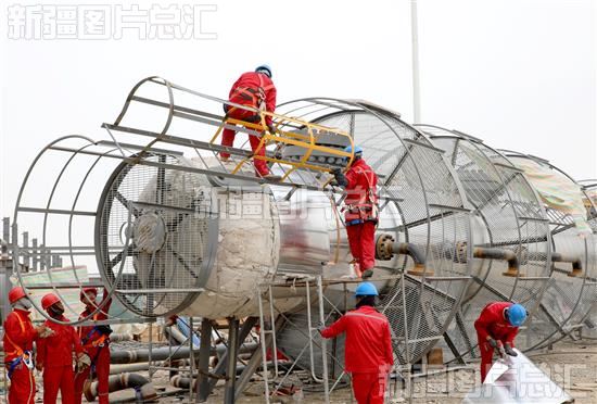 2023年8月22日,塔里木油田工人在富源联合站建设现场为吸收塔加装保温材料。