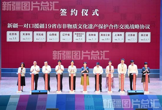 2023年8月23日,新疆—对口援疆19省市非物质文化遗产保护合作交流战略协议签约仪式现场。
