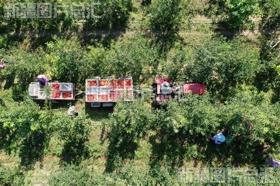 2023年8月26日,果农在呼图壁县五工台镇龙王庙村海棠果种植基地搬运海棠果(无人机摄)。