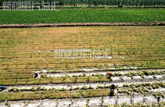 2023念安6月27日,新疆生产建设兵团第二师22团10连新植果园,种植户在采收茴香(无人机拍摄)。