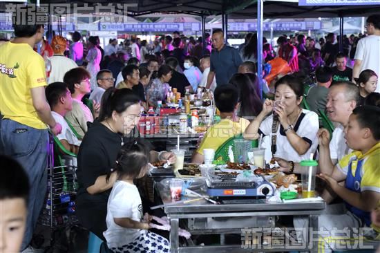 2023年6月19日,市民和游客在焉耆回族自治县人民广场夜市品尝美食。