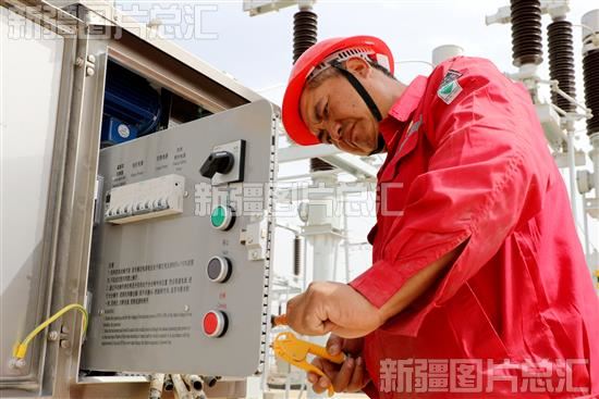 2023年8月22日,塔里木油田工人在富源联合站建设现场检查电动设施。