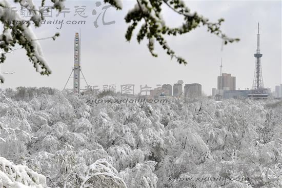 4月23日,红山公园刚刚发芽的绿树被春雪完全盖住。