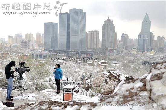 4月23日,央视记者在红山公园顶拍摄乌鲁木齐雪景。
