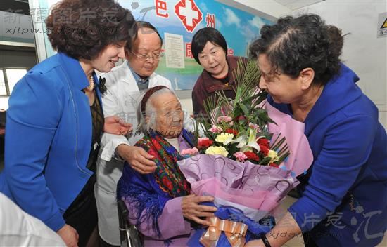 2014年5月6日下午,巴州妈妈互助协会成员向高兰芹老阿姨献花。为迎接“母亲节”,新疆巴州妈妈互助协会组织部分成员,带着慰问金、生活用品等来到库尔勒市康寿老年公寓,慰问106岁的高兰芹。