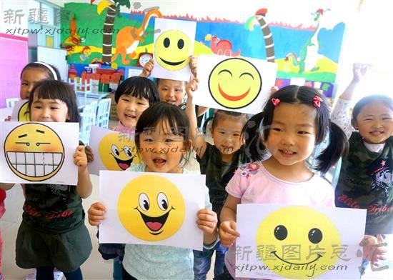 2014年5月8日,裕民县第一双语幼儿园的小朋友们在展示自己画的笑脸脸谱。当日是“世界微笑日”,裕民县幼儿园组织孩子们开展了内容丰富的微笑游戏活动,通过活动让孩子们感受笑容带来的温暖。
