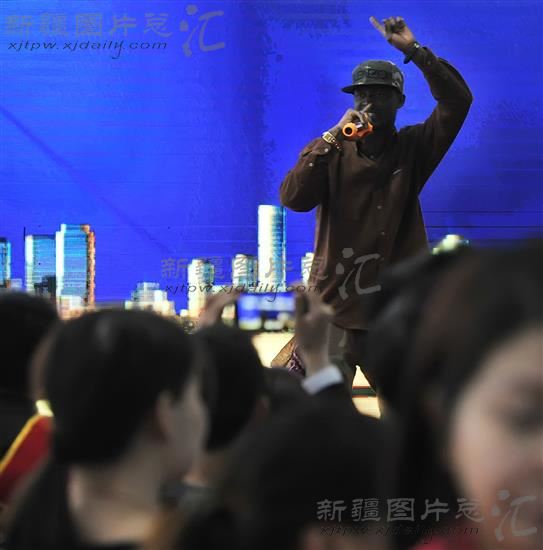 2014年5月8日,黑人说唱歌手在参展商展台前表演。