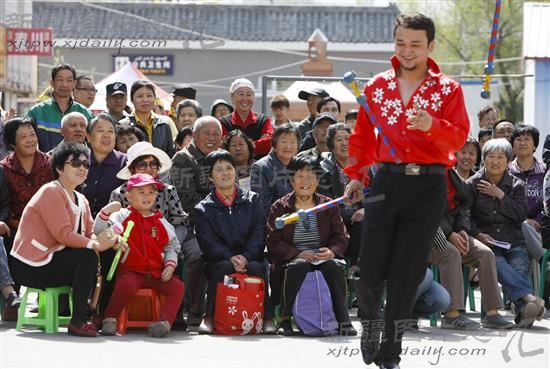 2014年5月9日,在乌鲁木齐市幸福城市花园社区前的空地上,辖区居民观看演员表演的杂技。
