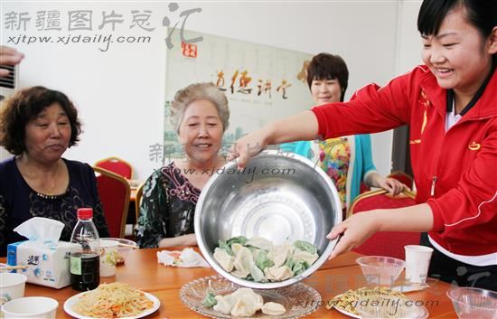 2014年5月9日,库尔勒市建设街道凌达社区组织辖区老人开展了“关爱母亲,百人饺子宴”活动。