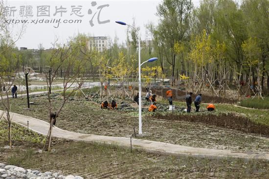 2014年5月12日,在乌鲁木齐市团结路天山公园内,乌市园林绿化工程公司工作人员正在种植宿根花卉。