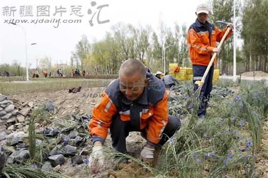 2014年5月12日,在乌鲁木齐市团结路天山公园内,乌市园林绿化工程公司工作人员正在种植宿根花卉。