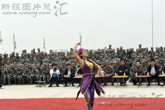 2014年5月11日,疏勒县文工团演员在为驻守在帕米尔高原的南疆军区某部官兵表演节目,为官兵们送去欢乐和祝福。